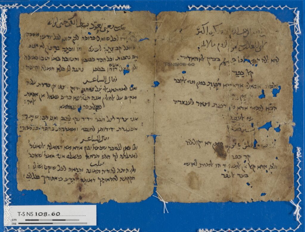 This otherwise unknown Arabic poem seeks to calm the anxieties and worries that befall most people at some stage in their life. The remarkable feature of this poem is that it is “Jewish” literature, at least to the extent that it was written by a Jew in Hebrew script (but Arabic language) for a Jewish readership. However, we cannot be sure as to whether the original author of the Arabic poem was a Muslim or a Jew, and it demonstrates the universality of the challenges that faced people, no matter what their religion. Particularly interesting is the use of Islamic tropes to promote well-being, with a literary reference to hope from a Qur’anic passage – copied out in Judaeo-Arabic by a Jew for a Jewish audience in a Muslim-majority land. Such fragments show the diverse cultural milieu of the pre-modern Islamicate world.